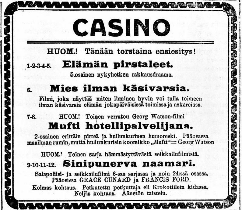 Casino –teatterin rakennutti Yliopistonkadun, silloisen Venäjän Kirkkokadun varteen varatuomari Gustaf Plathin, ja se avattiin 16.2.1913 elokuvalla ”Isänmaan puolesta”. Lähdekirjallisuus mainitsee teatterin suunnittelijaksi arkkitehti August Krookin, mutta piirustuksissa komeilee kuitenkin arkkitehti Alex Nyströmin nimikirjoitus.