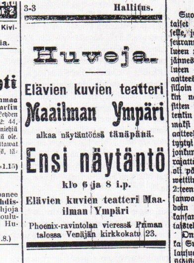 Avajaisilmoitus Turun Sanomissa oli vaatimaton, yhden palstan levyinen, joka kertoi: ”Ensi näytäntö tänään klo 5, 6, 7 ja 8 i.p., Elävien kuvien näyttely Maailman Ympäri”.