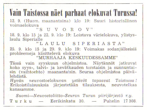 Turku sai ensimmäisen ”esikaupunkiteatterinsa” vuonna 1947, jolloin paikallinen Suomi-Neuvostoliitto –seura ryhtyi esittämään elokuvia Kirkkotiellä sijainneessa Taisto-talossa. Tarkoitusta varten taloon rakennettiin asetusten mukainen konehuone, josta kuvat esitettiin juhlasaliin. Konehuoneeseen hankittiin yksi neuvostoliittolaisvalmisteinen SKP-26 –merkkinen esityskone.