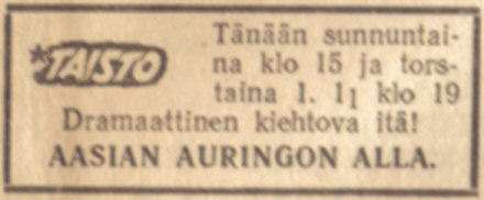 Joitakin esityksiään tämä teatteri toki ilmoitteli Turun Sanomissa. Teatterin nimenä oli vain yksinkertaisesti ”Taisto”, tähdellä varustettu logo. Ilmoituksista päätellen ohjelmistoon kuului neuvostoliittolaisia tai muualla itäblokissa valmistettuja filmejä. Jossain asialähteessä mainitaan teatterin toimineen ”Nummenmäen elokuvat” –nimisenä, mutta lehti- ja valokuvatietojen perusteella nimenä on ollut ”Taisto” tai ”Taiston elokuvat”.