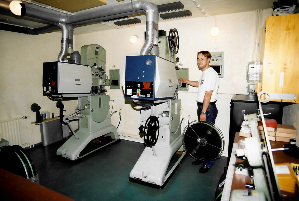 Kino-Turun konehuoneessa 1984. Jari Mäkilä Philips -projektorin ääressä. Nämä koneet siirrettiin modifioituina jatkamaan työtään Julia 1 -saliin
